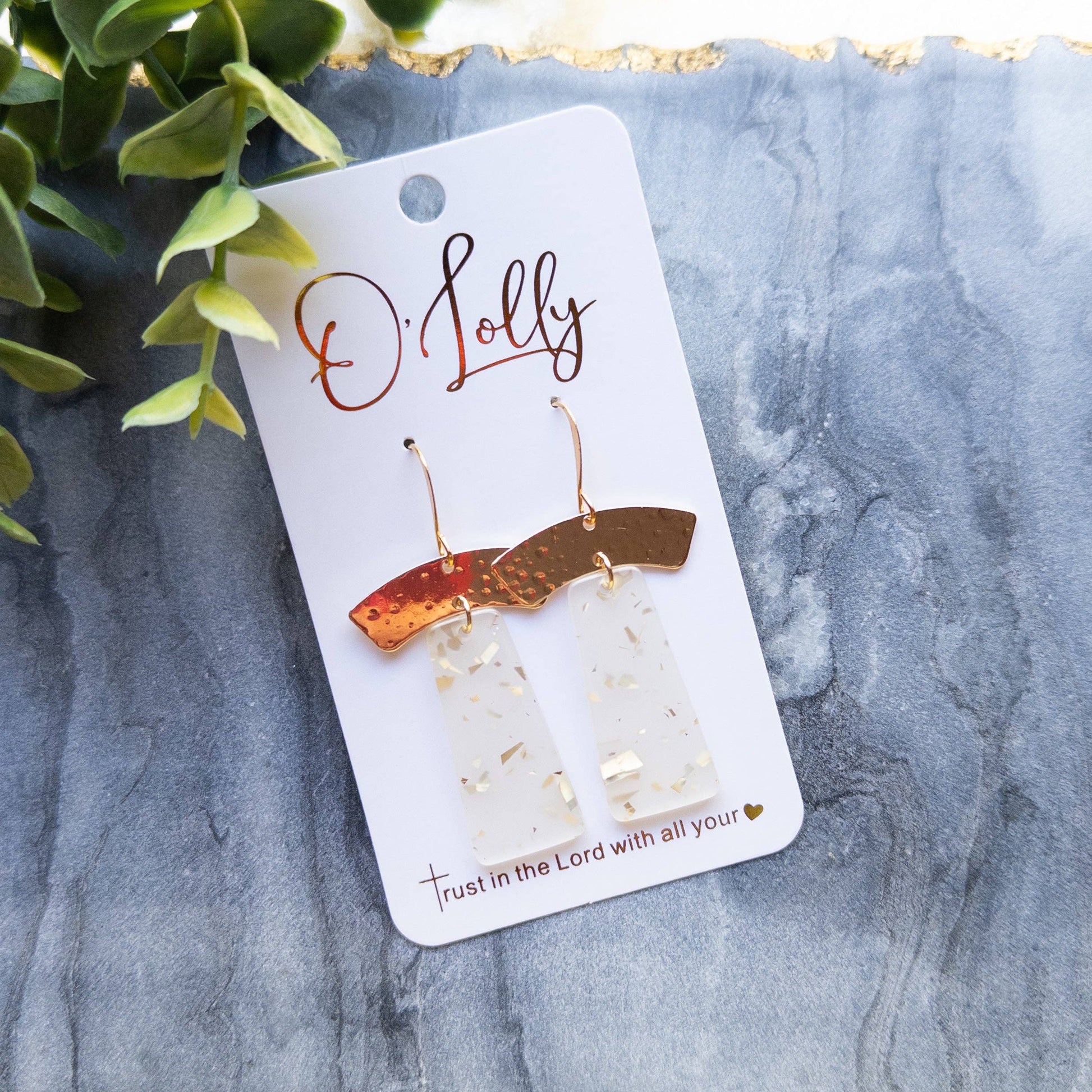 Gold hammered connector earrings with a a gold flake dangle